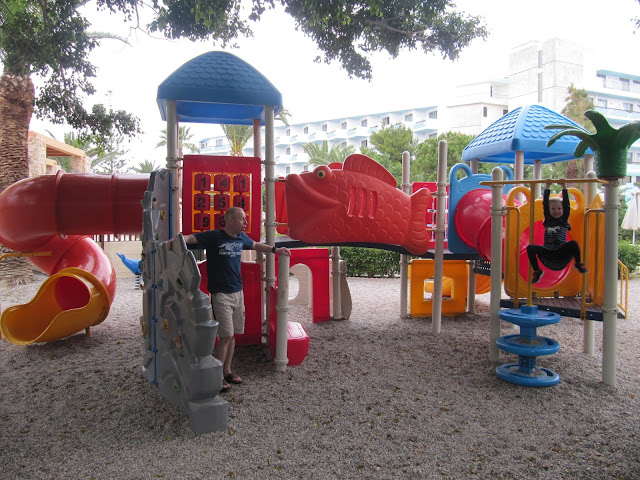 Det var mulet då vi kom fram men varmt. Vi gick omkring på hotellområdet en stund och åt mat på hotellets restaurang. Vi åt både frukost och middag på hotellet. Känns bäst med barnen så tycker jag. Det finns mycket att välja på på morgonen och på kvällen behöver man inte fundera vart man skall gå och äta då klockan börjar närma sig matdags.